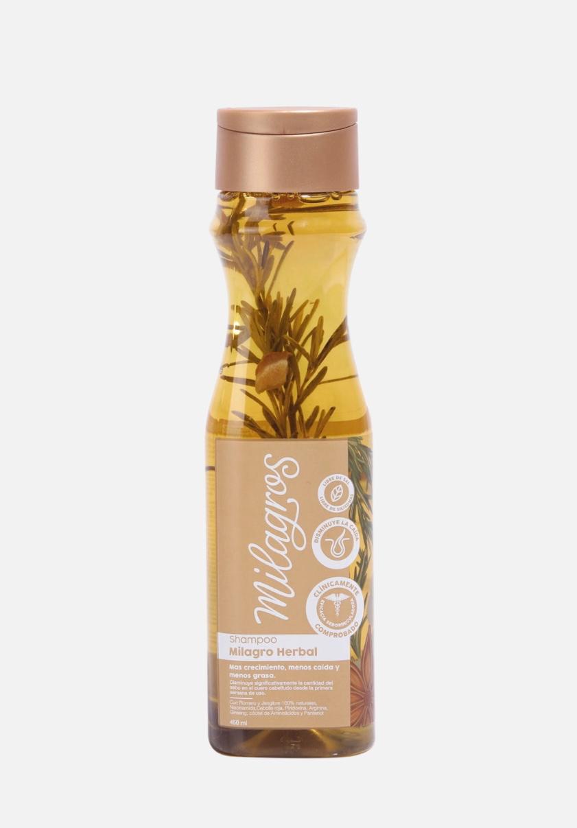 - Milagro Herbal es un producto con una formulación diseñada para fortalecer el cabello, controlar la grasa, reducir la caída y promover el crecimiento, combinando un coctel de aminoácidos con hojas de romero y trozos de jengibre. Este shampoo proporciona suavidad, hidratación y limpieza, mejorando la elasticidad, resistencia y cuidado de la fibra capilar.